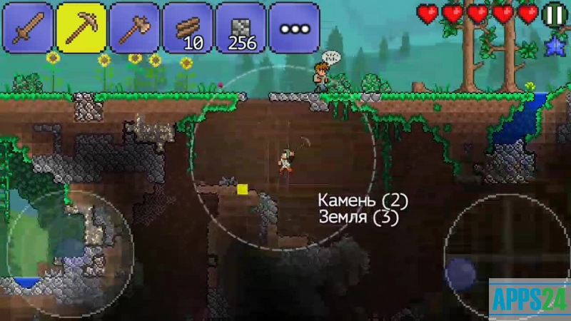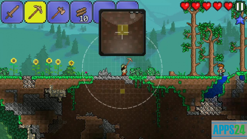 Terraria ist eine Symbiose aus Survival- und Aufbausimulator für Android-Geräte mit Elementen des RPG-Settings und 2D-Seitenansicht-Grafik. Es unterstützt sowohl Einzel- als auch Mehrspielerspiele (bis zu 4 Spieler pro Welt). Die Spieler kämpfen in riesigen, zufällig generierten Welten ums Überleben, von vertrauten Feldern oder Wäldern bis hin zu spektakulären fliegenden Inseln oder der unheimlichen Unterwelt.